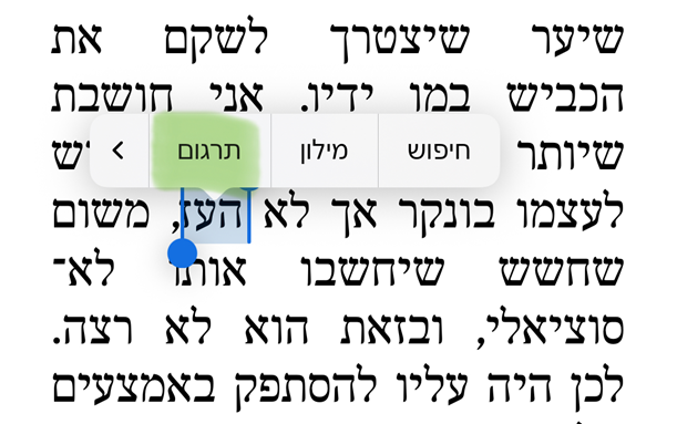 לחיצה ארוכה על מילה כדי לפתוח את התפריט > בחירה באפשרות החדשה ״תרגום״.